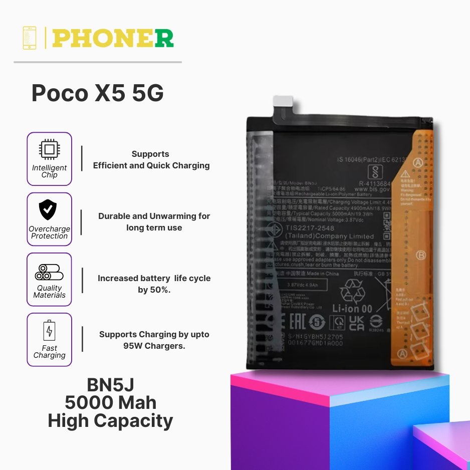 The Mobile Battery for Poco X5 5G BN5J comes with inbuilt safety features that protect your phone from overcharging, overheating, and short circuits. These mechanisms are crucial to ensuring your phone remains safe, preventing any damage to your device while prolonging the battery’s lifespan.