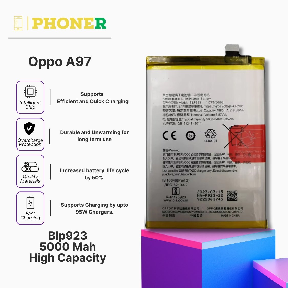 • Shopping for the Mobile Battery for Oppo A97 BLP923 through Phoner.in offers a hassle-free experience, complete with fast delivery and responsive customer support.