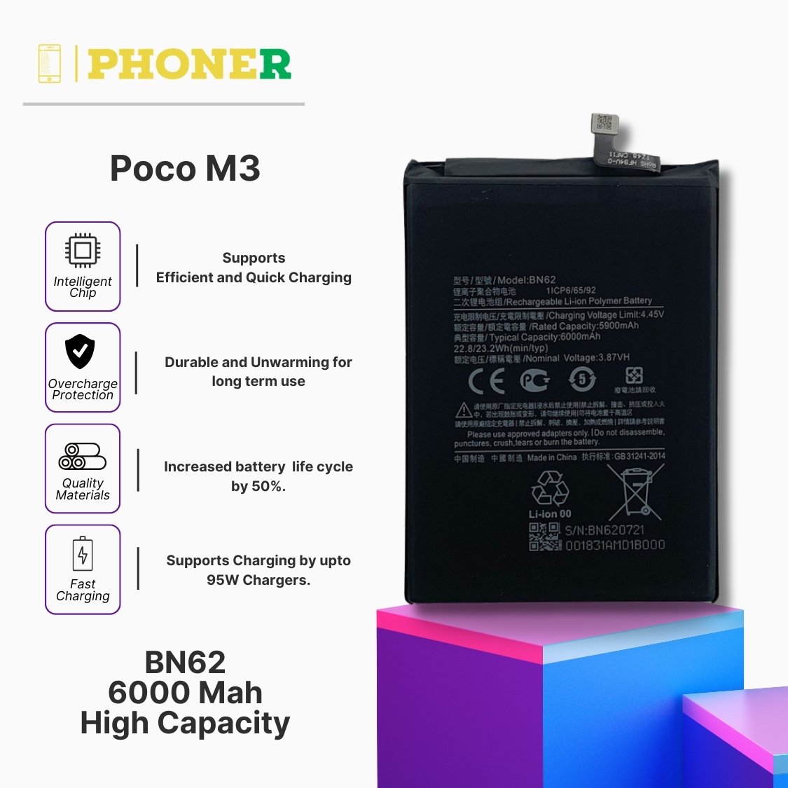 Ready to give your Poco M3 the upgrade it deserves? Order our Mobile Battery for Poco M3 BN62 exclusively on phoner.in and experience the difference a reliable battery can make. With a 6-month guarantee, advanced features, and the trust of phoner.in, you’re not just buying a battery – you’re investing in the continued excellence of your device.