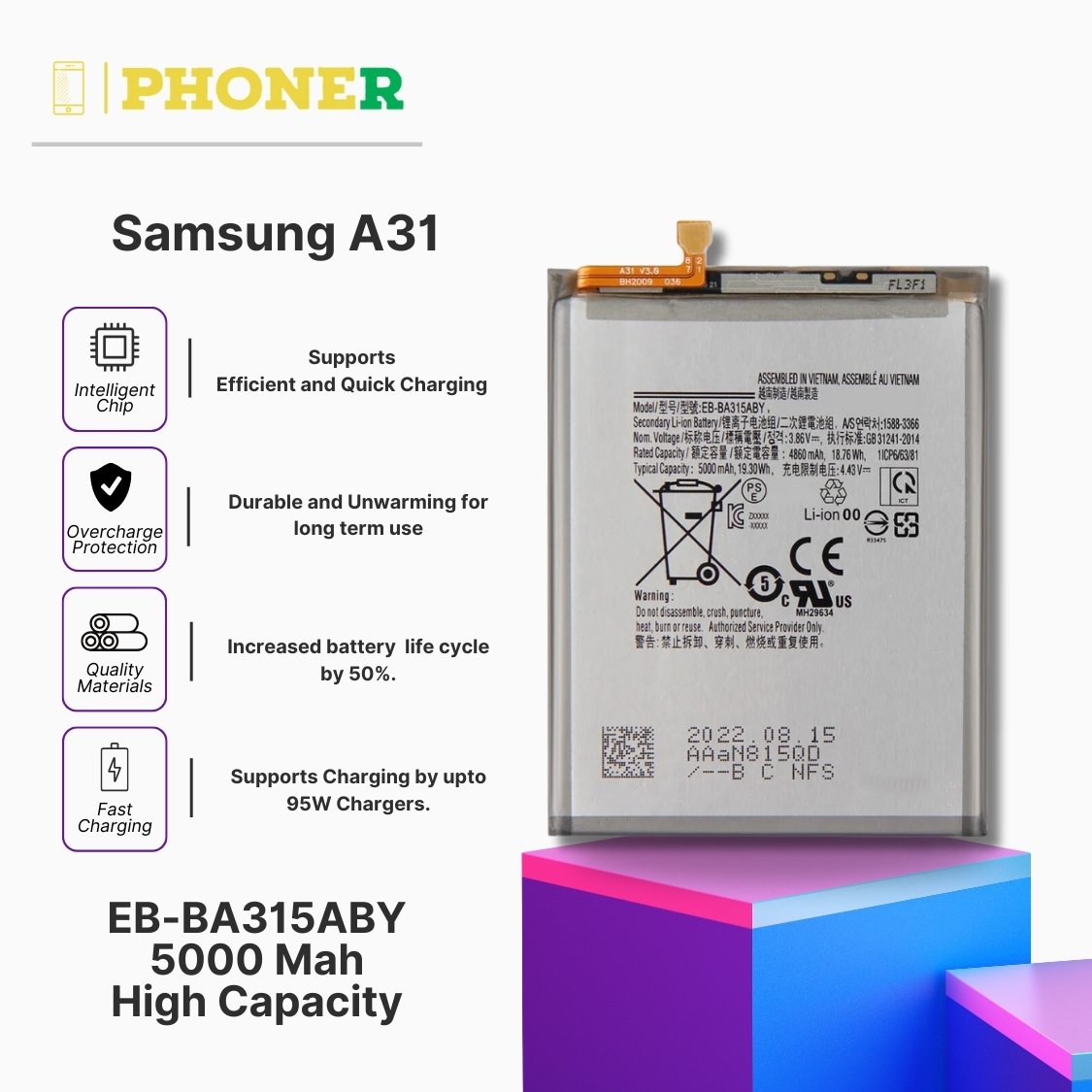 Ready to give your Samsung Galaxy A31 the upgrade it deserves? Order our Mobile Battery exclusively on phoner.in and experience the difference a reliable battery can make. With a 6-month guarantee, advanced features, and the trust of phoner.in, you’re not just buying a Mobile Battery for Samsung Galaxy A31 – you’re investing in the continued excellence of your device.