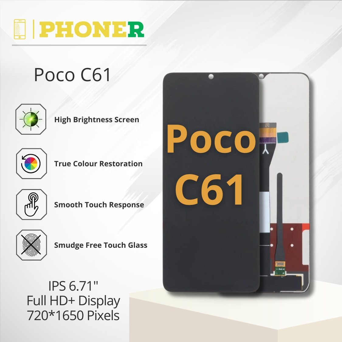 Whether you’re fixing your phone for personal use or resale, this replacement offers durability, premium quality, and exceptional value. Shop confidently at Phoner.in and enjoy fast delivery, a 3-day warranty, and affordable pricing. Restore your Poco C61 to its original brilliance with our premium replacement display today!