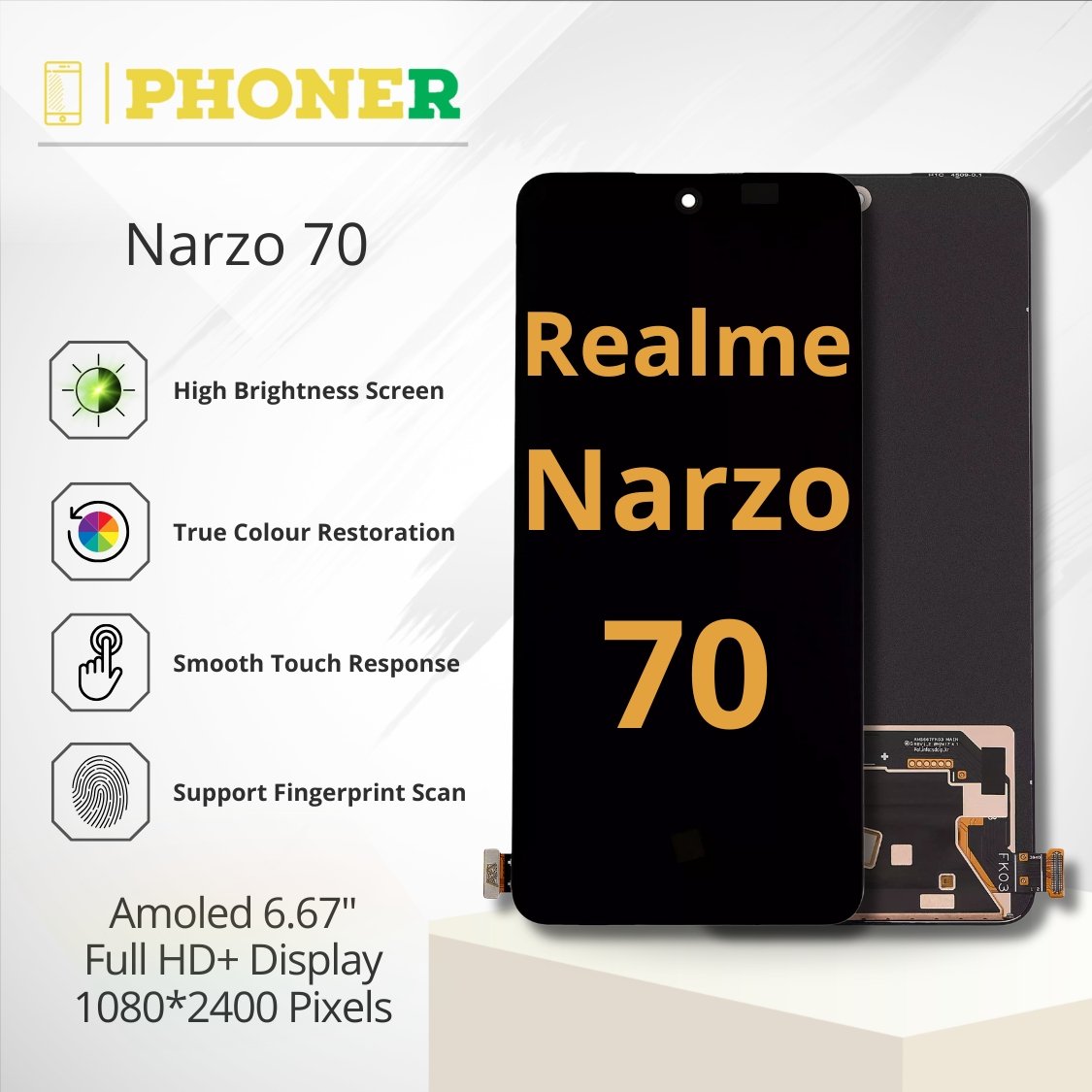 Whether you’re repairing your phone for personal use or resale, this replacement guarantees exceptional quality, durability, and affordability. Shop confidently at Phoner.in and enjoy fast delivery, a 3-day warranty, and competitive pricing. Restore your Realme Narzo 70 to its original brilliance with our premium replacement display today!