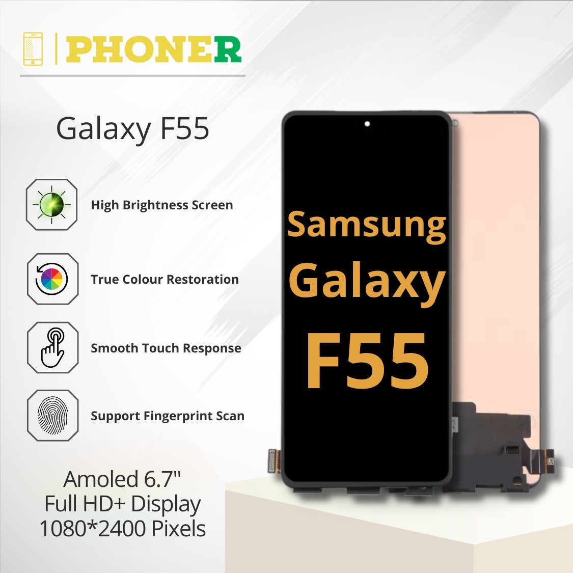 Choose Phoner.in for your Samsung F55 Display replacement needs, and enjoy a restored device that looks and performs just like new!